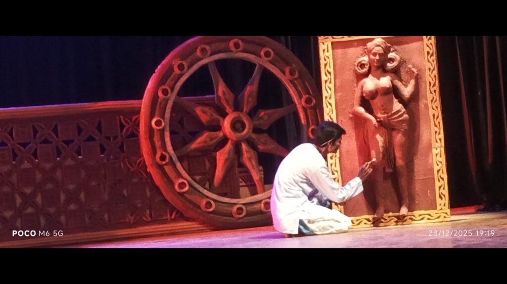 भारतीय रंगमंच के इतिहास और मानवीय संवेदना को एक साथ मंच पर सजीव करता नाटक “कोणार्क” दर्शकों को आत्मविभोर कर गया। यह नाटक विश्वविख्यात कोणार्क सूर्य मंदिर के निर्माण से जुड़ी कथा को केंद्र में रखकर सृजन, संघर्ष और बलिदान की एक गहन मानवीय कहानी प्रस्तुत करता है।
